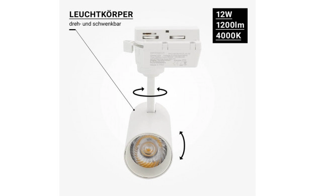 Lumière de Rail LED 12W 220V Bridgelux COB Chip Corps Blanc Referrence 15103